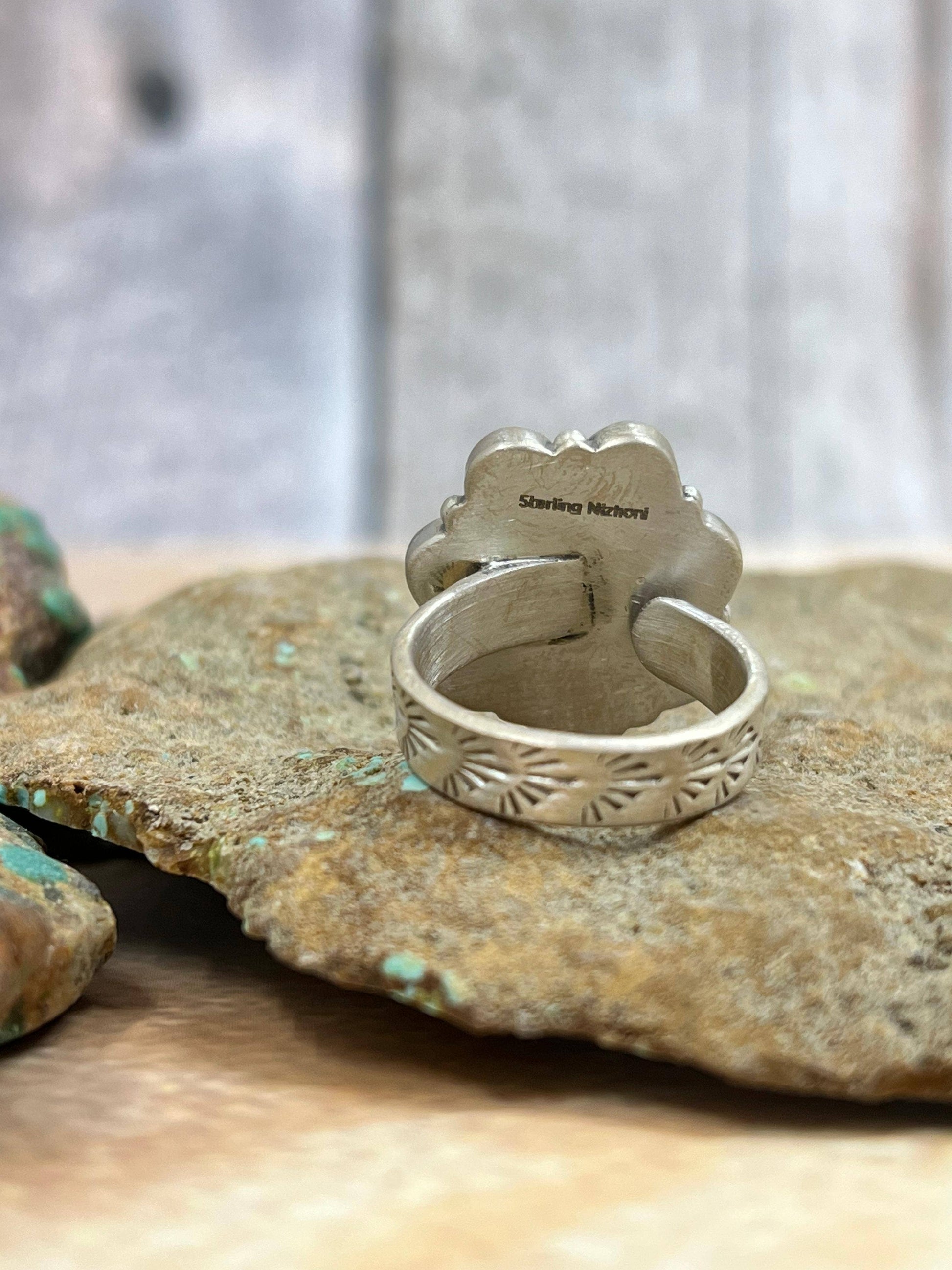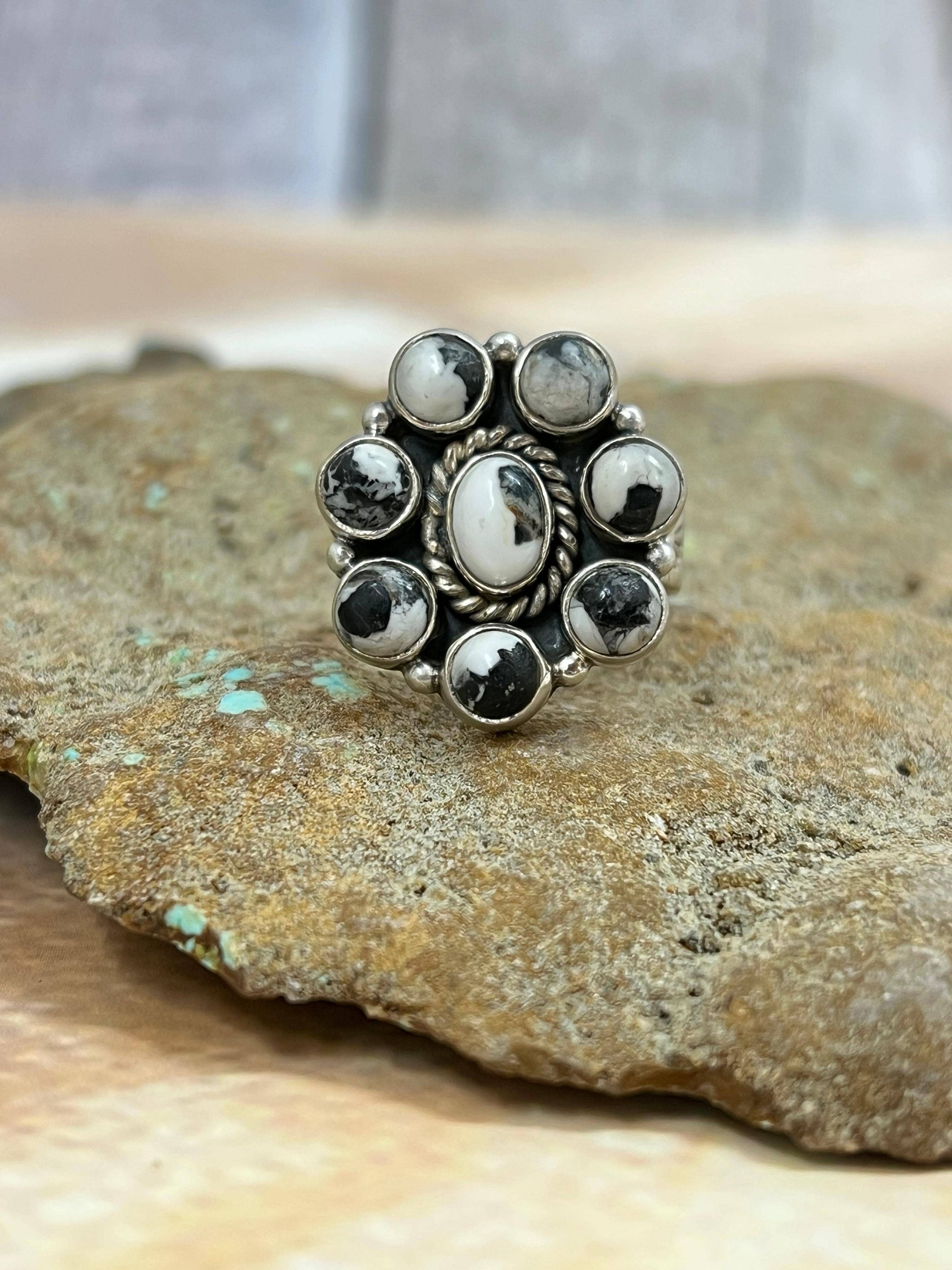 A handcrafted sterling silver ring featuring a striking White Buffalo turquoise stone, known for its high-contrast mix of bold black matrix and creamy white tones. This adjustable statement piece is designed to stand out while offering a comfortable, versatile fit.