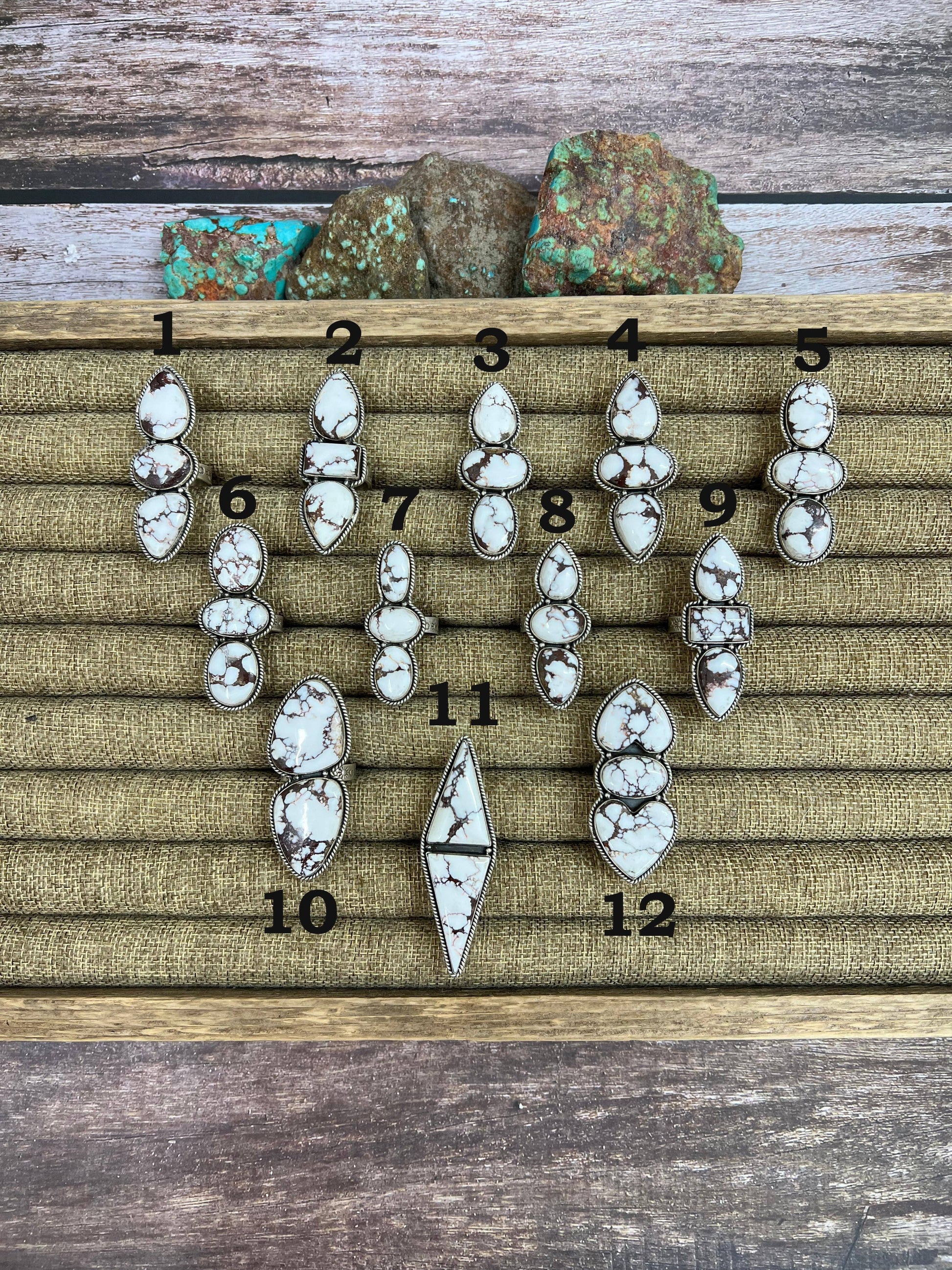 A handcrafted sterling silver ring featuring a bold Wild Horse stone with natural swirls of cream, chestnut, and deep brown. This elongated adjustable ring is designed to stand out showcasing the untamed beauty of the stone in every piece.