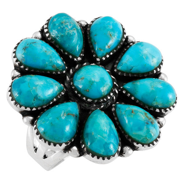 This Turquoise Ring is a bold and beautiful tribute to traditional western design. Crafted in solid sterling silver, it features a striking floral cluster of teardrop-shaped turquoise stones surrounding a central round turquoise gem. Each stone is rich with natural veining, giving the piece an earthy, authentic feel.